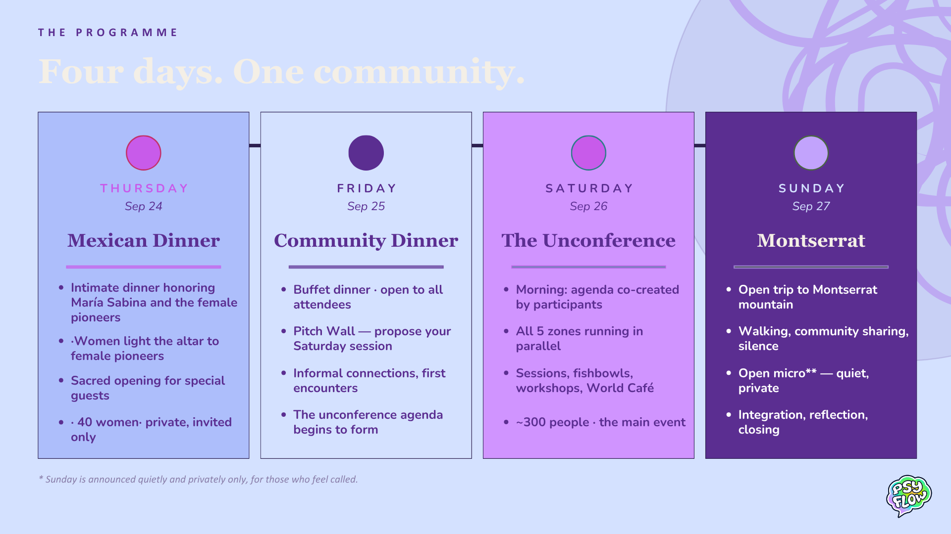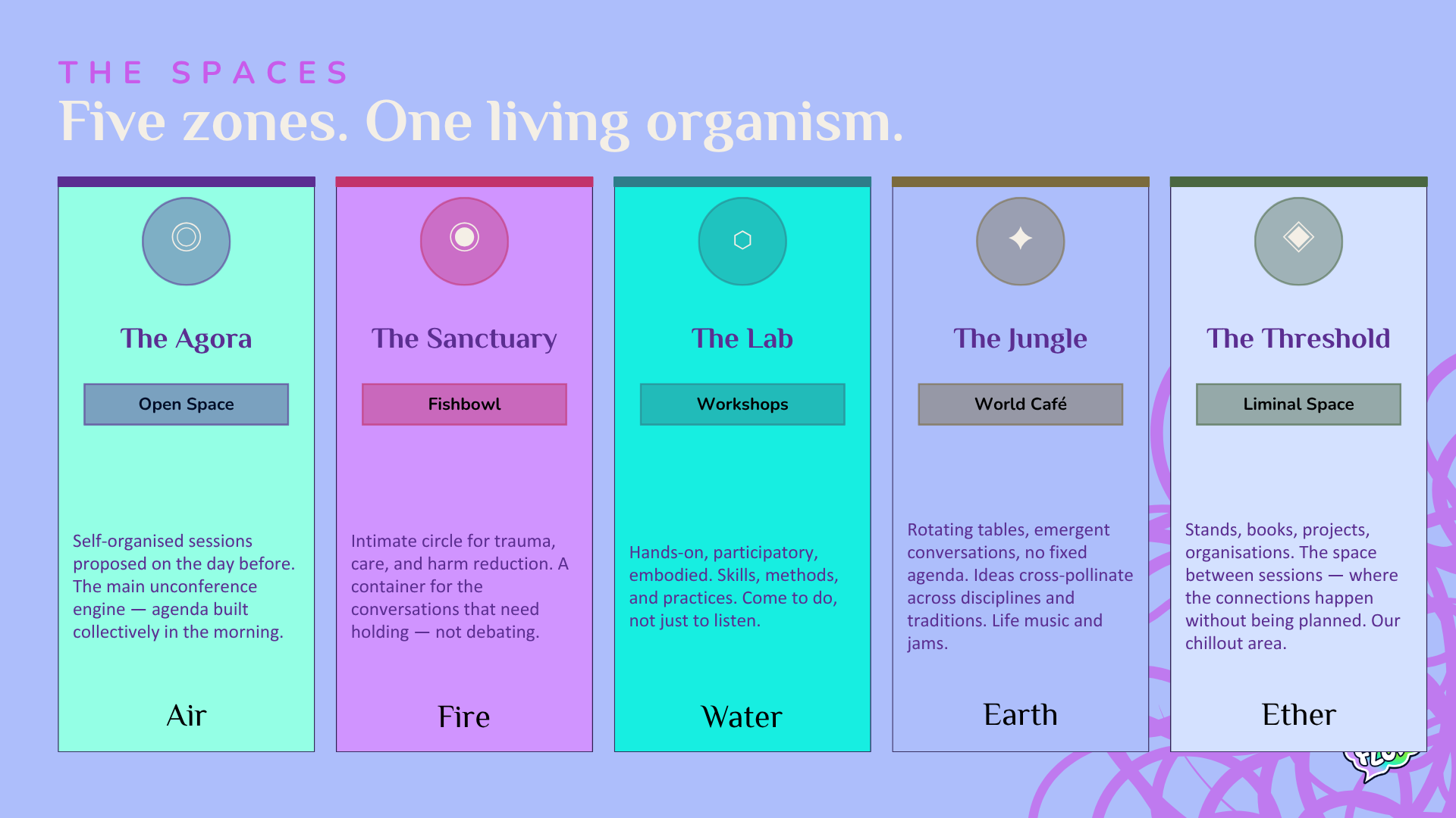 Saturday - The unconference The programe, co-created the night before and on the same morning, comes to life across the five spaces of the venue. Sessions, panels, workshops, circles, practices - proposed and led by the people in the room. Anyone can facilitate. Anyone can attend. The Law of Two Feet applies: if you're not learning or contributing, it's your right - and your responsibility - to move, and keep flowing.